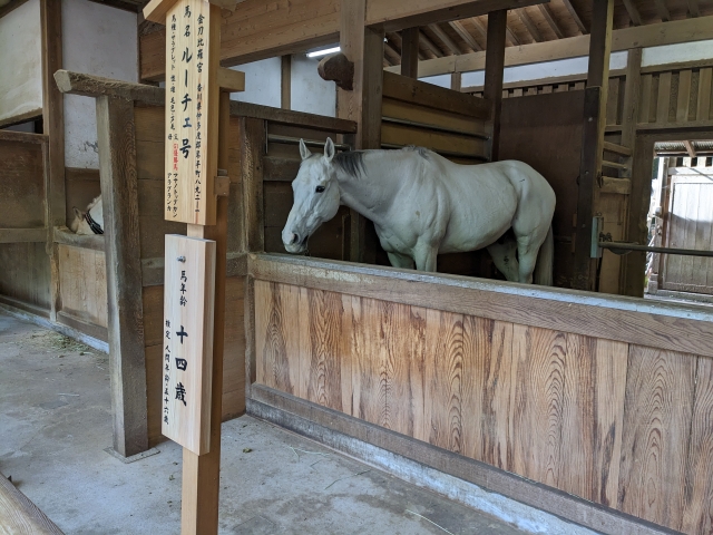 白馬が見える神馬舎(しんめしゃ)。現代の神社では木や銅でできた馬が奉られていることが多いですが、この金刀比羅宮の神馬はホンモノの馬!「月琴(げっきん)号」と「ルーチェ号」という2頭の馬が飼育されています。