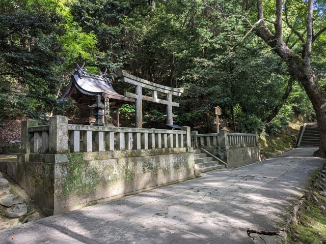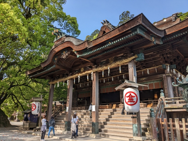 旭社の先の石段を上ると、御本宮に到着。大物主神と崇徳天皇を祭神としており、農業・殖産・医薬・海上守護の神として信仰されています。参道入口からここまで35分ほど。