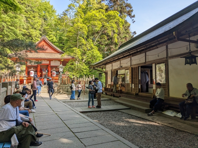 奥社の周辺には腰かけて休んでいる人の姿がたくさん。どうやら、奥社の社務所がオープンするのを待っているようです。