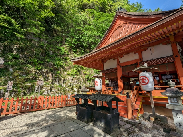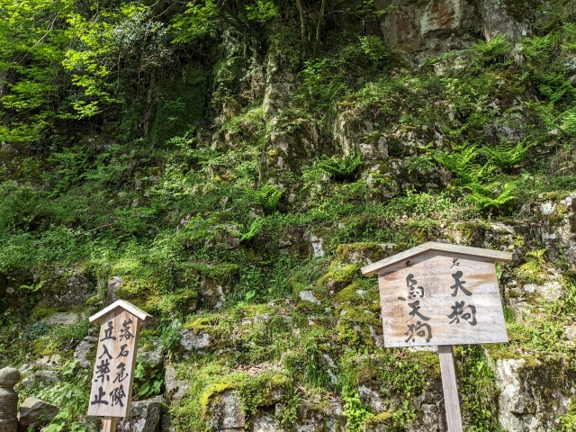 奥社に向かって左側の崖は、威徳巖(いとくのいわ)という名が付けられています。この岩場、よーく見てみると、「天狗」と「烏天狗」の面が納められています。