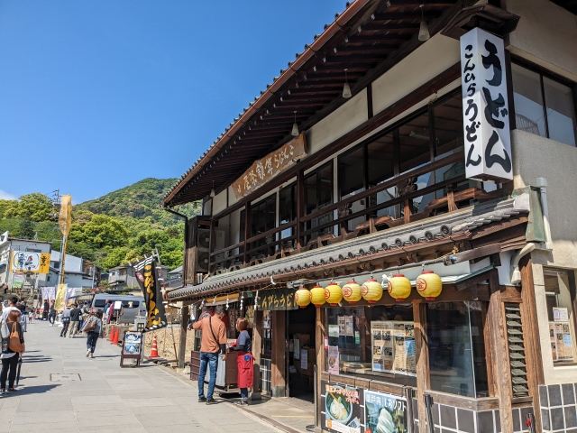 参道の入り口までは琴電琴平駅から徒歩5分、JR琴平駅から徒歩8分。