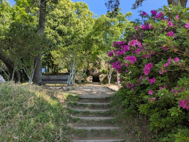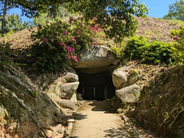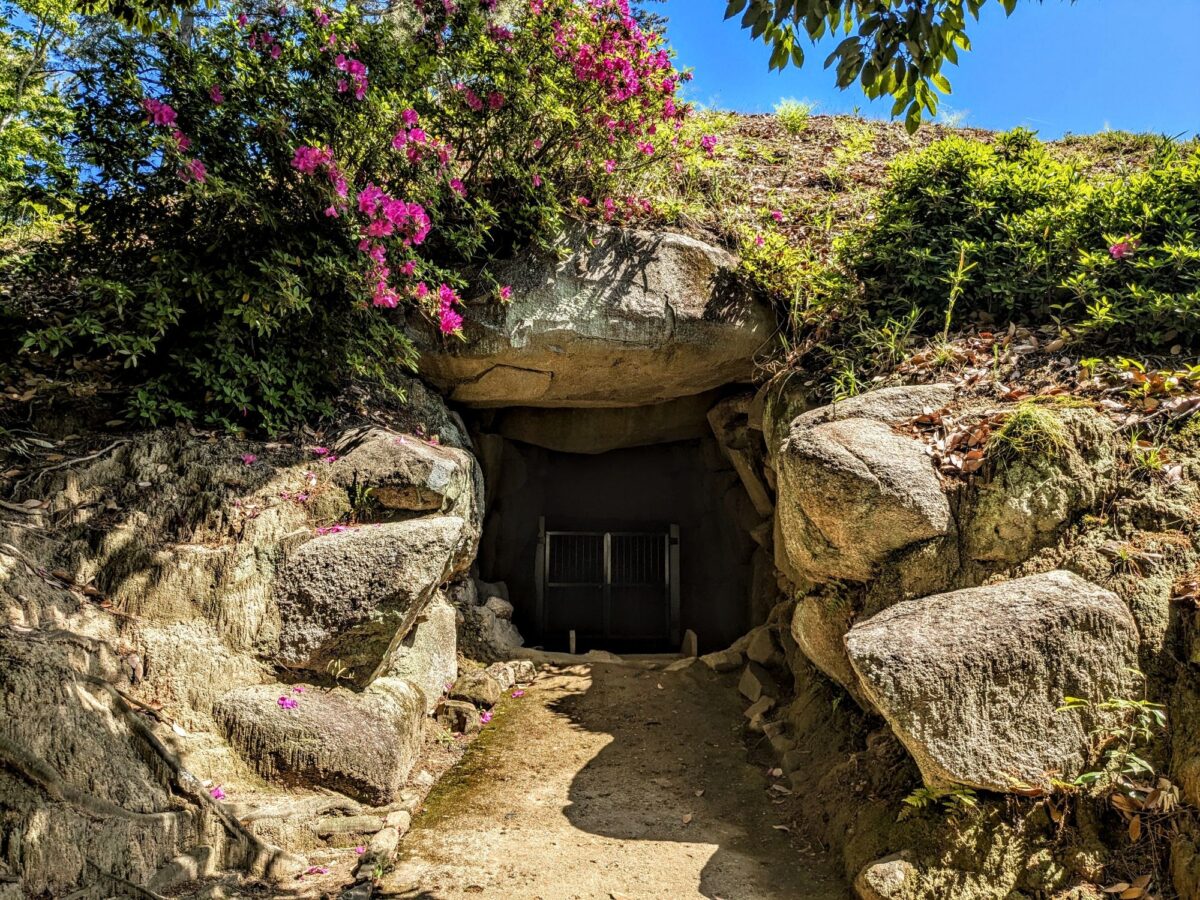 墳丘に沿って歩いて行くと、石室の入り口が見えてきます。5月はツツジがあざやかに彩り華やかな雰囲気。
