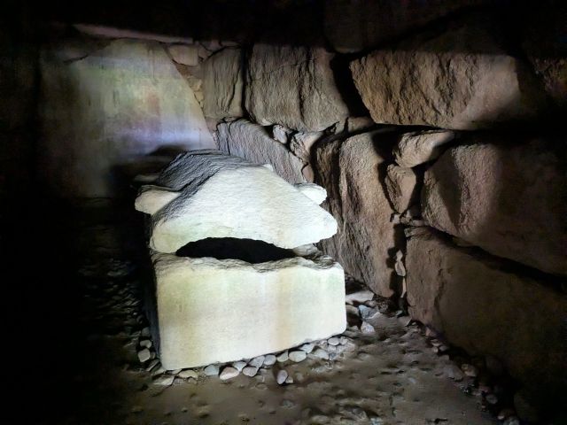 石室の奥にはフェンスが設置されており、その先を覗くと石棺が置かれています。