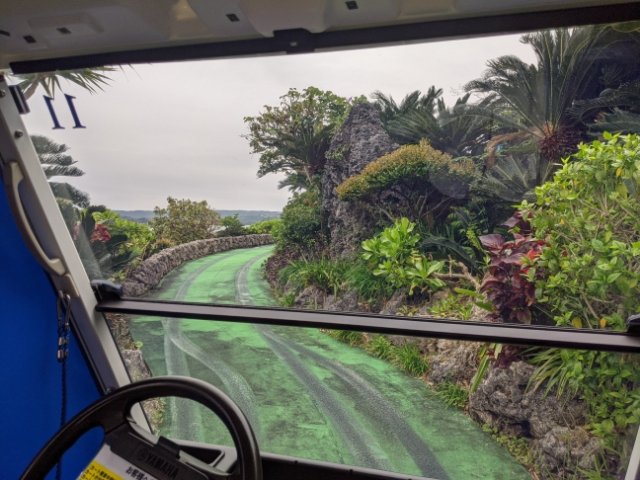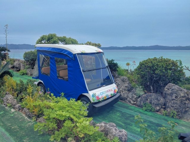 車内では古宇利島や古宇利大橋、オーシャンタワーの案内音声が流れています。ナゴパではパイナップルの成長過程が楽しめましたが、こちらのオーシャンタワーのカートは古宇利大橋を望む絶景が楽しめます。