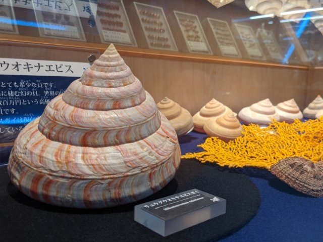 このうつくしい貝は非常に珍しいリュウグウオキナエビスという種類。レアものときくとその値段が気になってしまいますよね。展示によると、一つで数百万という高値で取引されており、「車より高い貝」として知られているそう。