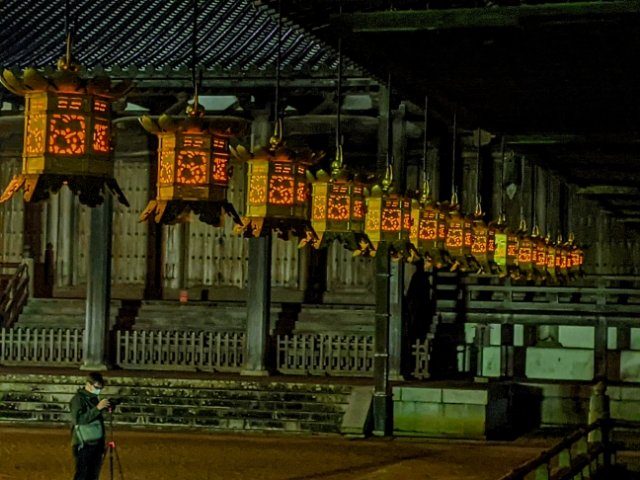 闇夜に浮かび上がる中門。昼の華やかな印象から一転して、神秘性を帯びた姿に。安置された四天王像は、今にも動き出しそうです。