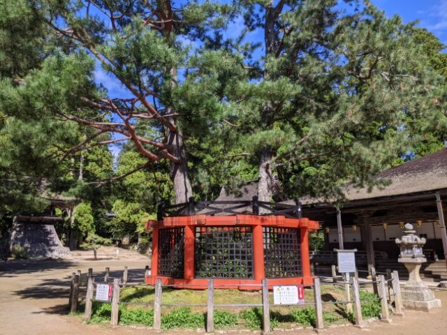 朱色の垣で囲まれた松の木。かつて弘法大師が日本に密教を広めるのにふさわしい場所を見つけるため、明州の港から法具である三鈷杵(さんこしょ)を投げます。その三鈷杵が引っかかっていたとされるのがこちらの三鈷の松。