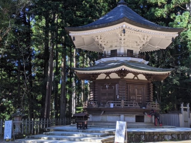 その名が示す通り六角形の六角経蔵。台座部分に取手が設けられており、ぐるっとまわすことで一切経という経典を一通り唱えたのと同じ功徳があるそう。実際にやってみたのですが、動き始めはとても重くかなりの力が必要です。一度動き始めると幾分かは楽になりますが、なかなか体力を使いました。