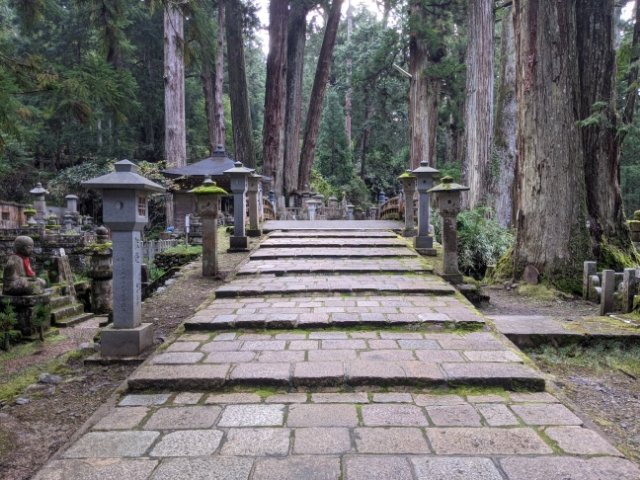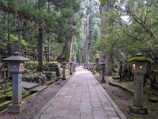 高野山奥之院といえば、ながーい参道!約2kmにわたる道は、一の橋からスタート。樹齢数百年と思われる巨大な杉の木立や、苔むした石灯籠が並ぶ中を進んでいきます。