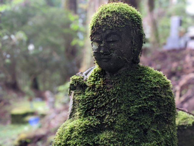 参道を少し外れたところで見かけた、全身が苔に包まれたお地蔵様。人気の無い場所で静かに坐する姿は、威厳を放ちます。