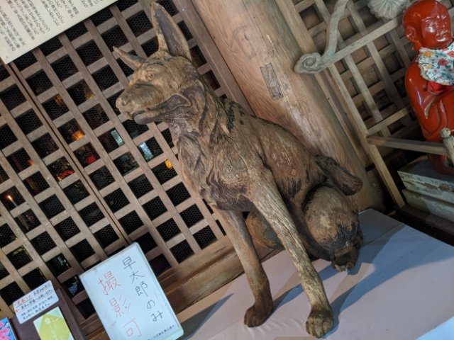 こちらの木彫りの犬の像は、かつて光前寺で飼われていた犬。とても強い犬で「早太郎」という名で呼ばれていました。この早太郎には、人々を救ったという伝説が残っています。