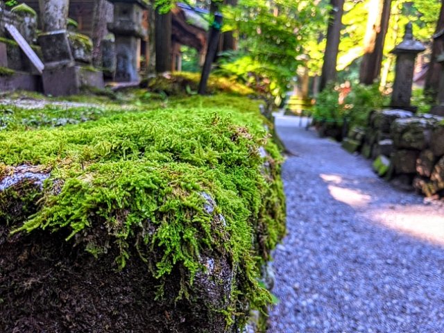 また、参道の石垣の中にはヒカリゴケが自生しています。ここ!といった案内は無いので、石垣をじっくり見ながら探してみたところ、ぼんやりとグリーンに輝くヒカリゴケを発見しました。