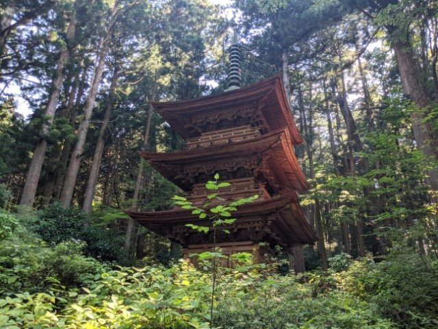 木々に包まれた荘厳な雰囲気の三重塔。南信州では唯一の塔で、その高さは17m。内部には五智如来像を安置しているそう。