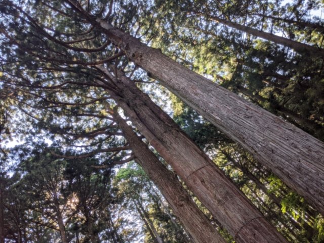 霊木の三本杉は、きれいに並んだ樹齢700年といわれる杉の古木。幹の太さもさることながら、見上げたときのその樹高と、枝の広がりが神秘的。