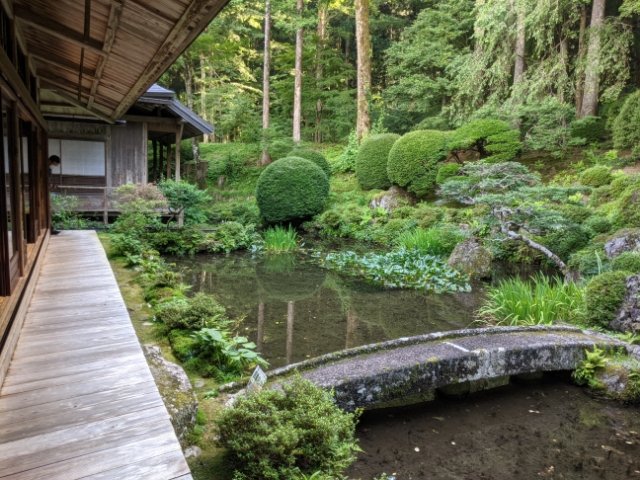 江戸時代初期に造られたとされていますが、正確な築造年および作者は不明。縁側に腰掛けて庭園を眺めることも可能で、ほっと一息つける場所です。