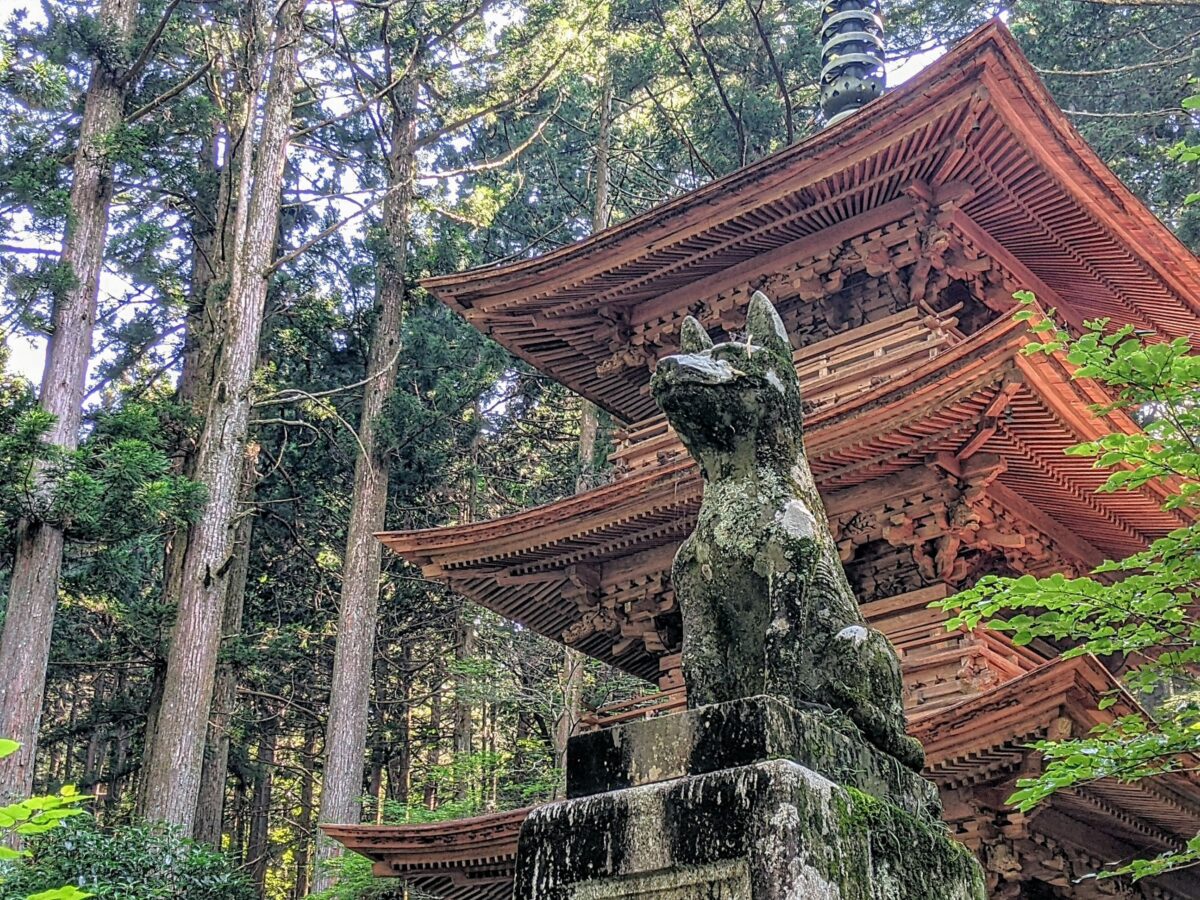 木立に包まれた趣深い古刹・光前寺。境内には杉の並木や敷き詰められた苔、森の中の三重塔など、情緒深い光景が続きます。人々を苦しめた怪物と勇敢に戦った霊犬・早太郎の伝説も残っています。