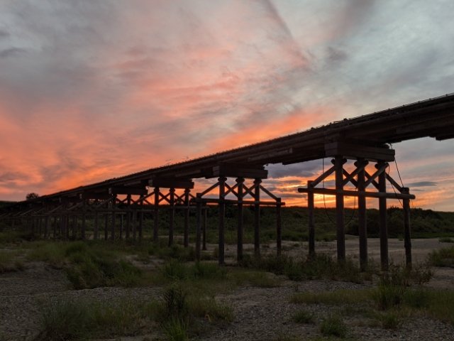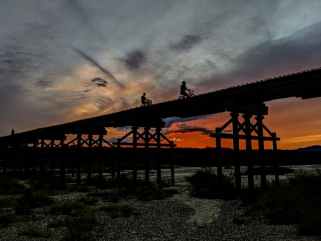 木津川に架かる歩道橋・上津屋橋(こうづやばし)は、増水時にあえて流されることで損壊を防ぐという特殊な機能を備えています。コンクリートにはない風情を感じさせる木造橋で、撮影スポットとしても人気。今回はちょうどサンセットに訪れることができました。