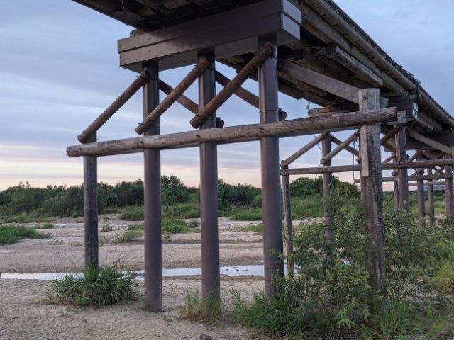 よくみると橋脚がコンクリートでしっかりと補強されています。さらに、1段持ち上げたような少し不思議なカタチ。