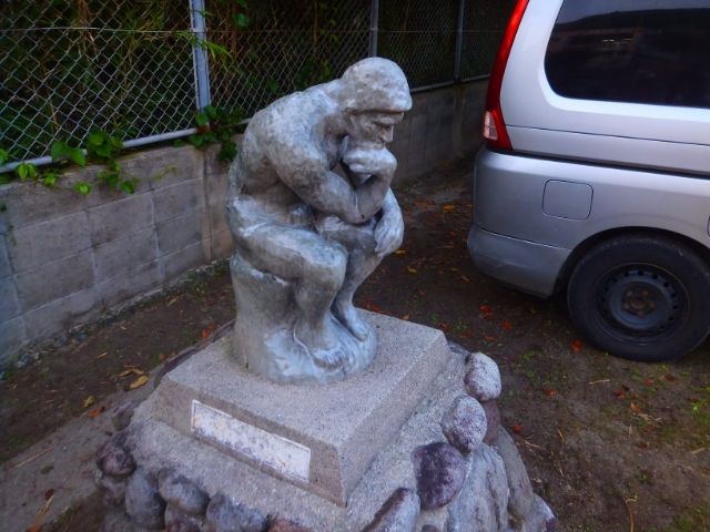 校庭には、二宮金次郎・・・と思いきや考える人が!ロダンの作品がなぜあるのかは不明です。