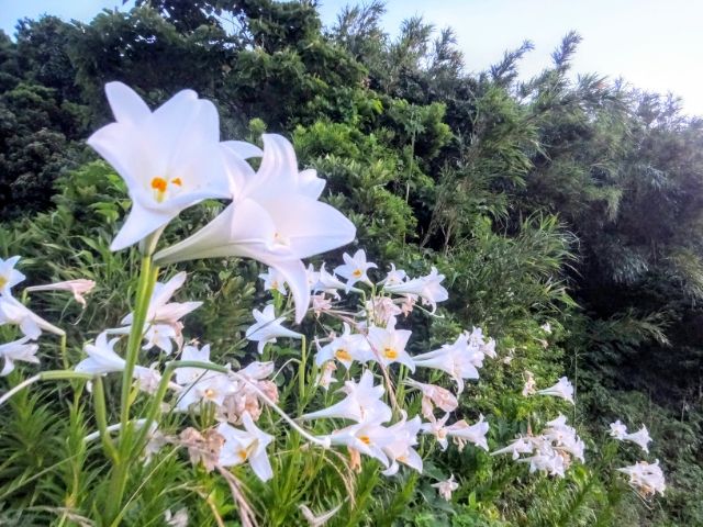 トカラ列島の旅のはじまりは早朝の口之島。集落&観光スポットへ向かうには、上り坂で一山越えなくてはいけません。ハードな道を越えた先には湧き水や温泉、そしてタモトユリをはじめとしたたくさんの花が咲いていました。