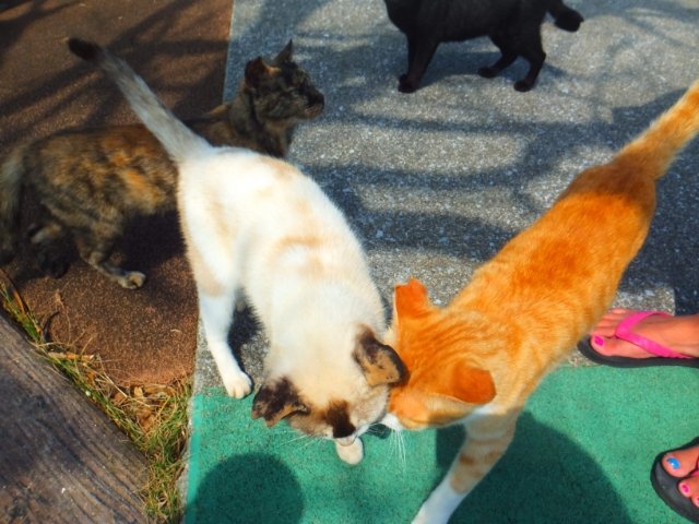 ここの猫たちは人慣れしており、ビニール袋をガサガサすると餌をもらえると思って近寄ってきます。