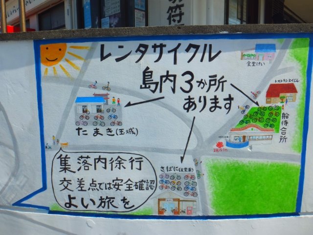 島内にレンタサイクル屋さんは3ヵ所ありますがそれぞれ数に限りがあります。もし船が混んでいた場合、下船したらまずはレンタサイクル屋さんへ向かうのが良さげです。