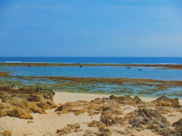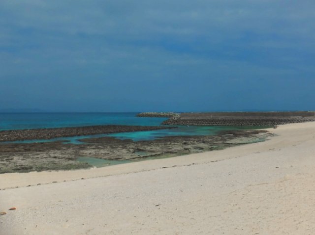 聖地をめぐるのも少し気が引けたので、とりあえずメーギ浜へ。白砂のビーチと青く美しい海が広がる海水浴場で、マリンスポーツやレンタルショップなどもあるレジャーな雰囲気の浜辺です。