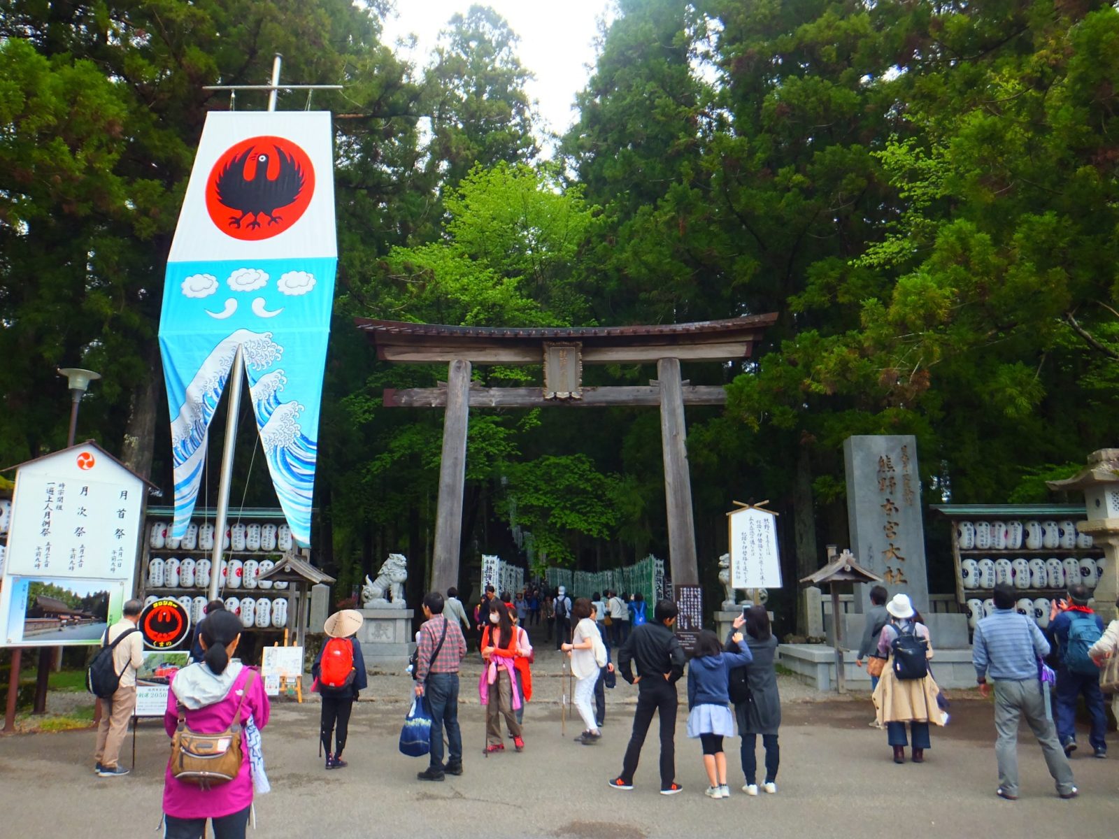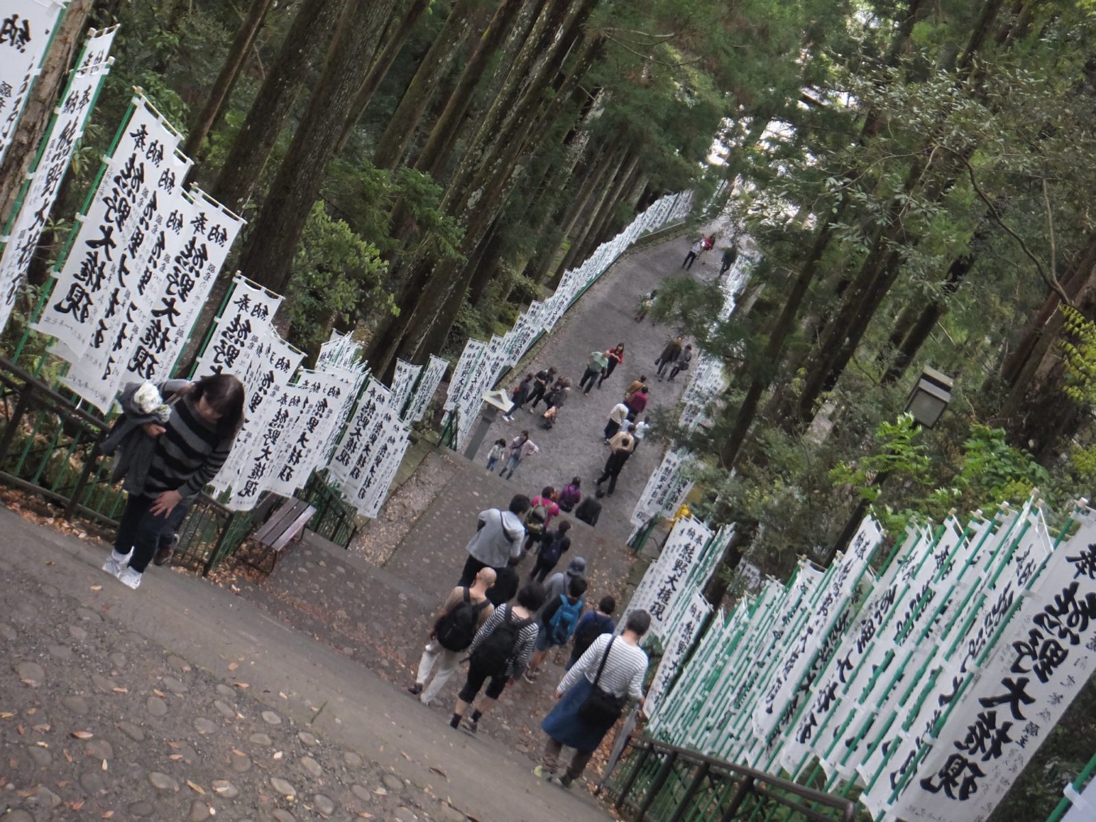 木々が立ち並ぶ参道には、熊野大権現の奉納のぼりがびっしり。白・黒・緑の3色に統一されており、独特な景観を示しています。