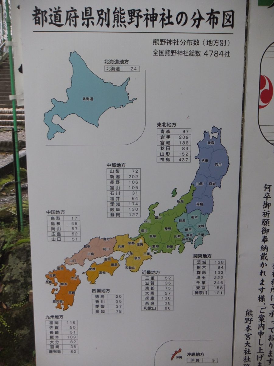 こちらは熊野神社の分布図。あちこちで見かける熊野神社ですが、日本全国に4,784社もあるそう!特に多いのは福島県で、437社も。そして、沖縄にも9社あります。そういえば、琉球八社のうち7社は熊野信仰の神社でしたね。