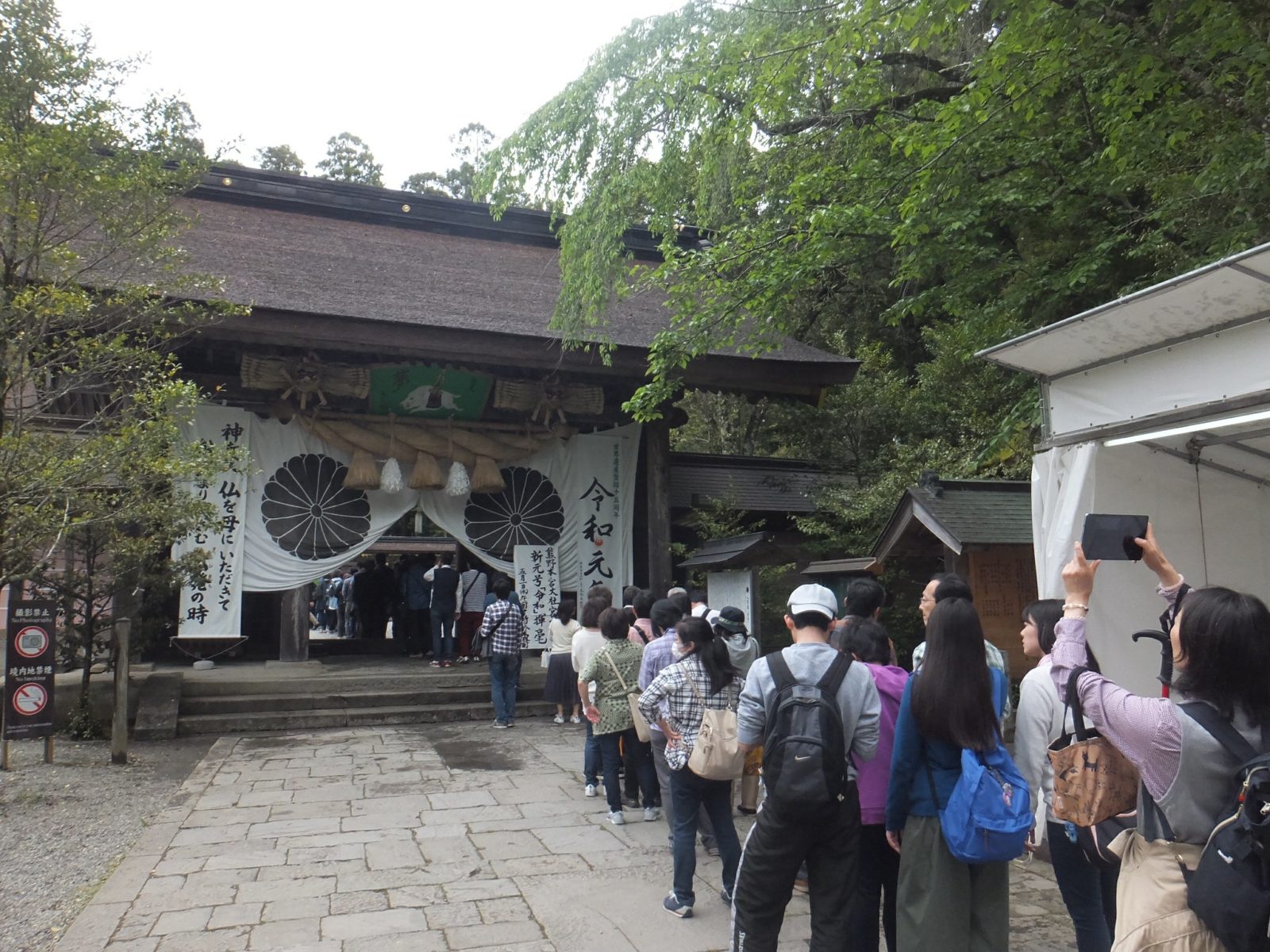 階段を登った先にあるのは神門。GW真っ只中でもあり、なおかつ平成最後の本日。参拝客はとても多く、ながーい行列ができてます。