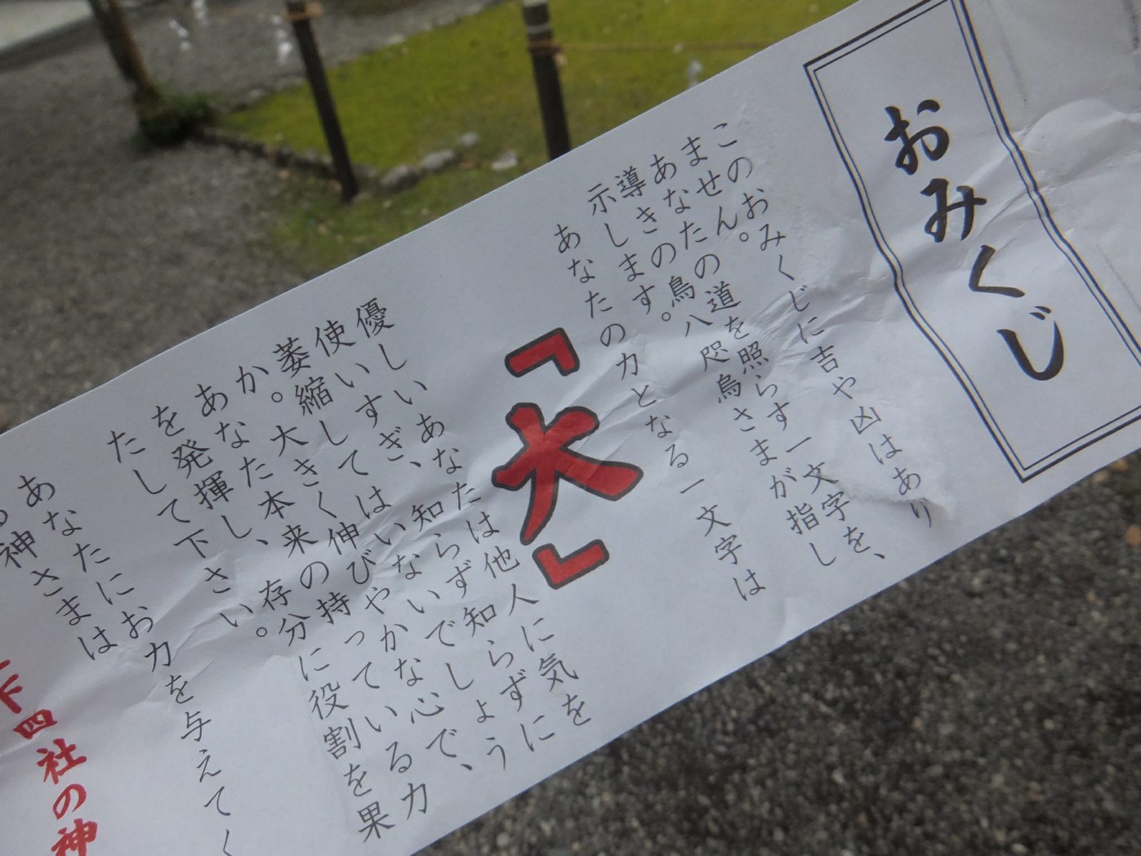 そんな八咫烏のおみくじは、吉や凶はなく「道を照らす一文字」を教えてくれるタイプ。