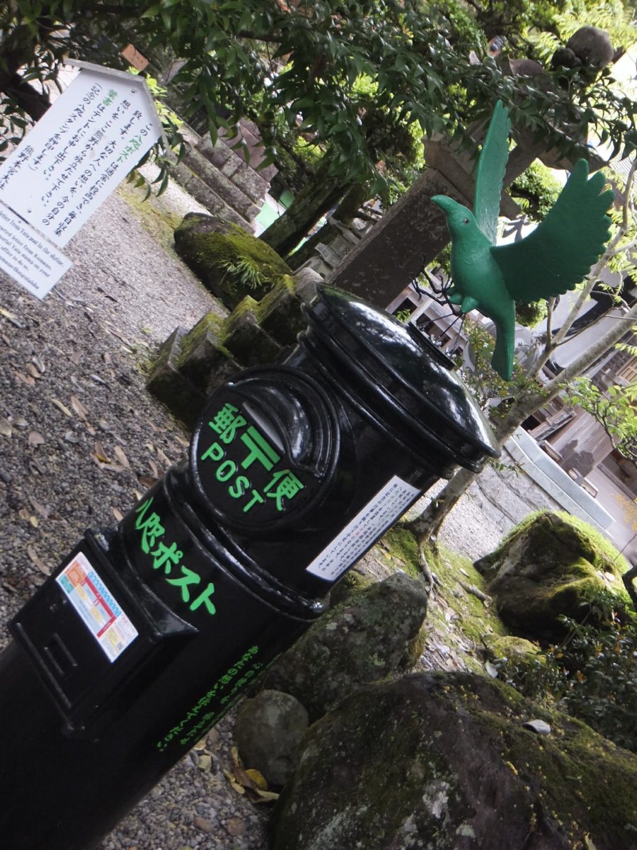わずかに入るグリーンがとってもあざやか。このポストに投稿する際、社務所に頼むと「出発の地より心をこめて熊野本宮」というスタンプも押してもらえるそうです。