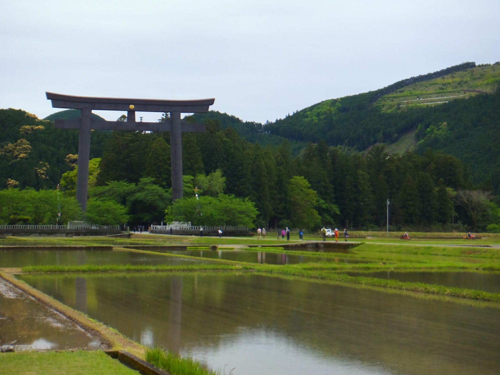 田んぼの真ん中にがいきなり現れる大鳥居。この鳥居が大斎原の入口。高さ33.9m、横42mと日本一の大きさを誇っています。