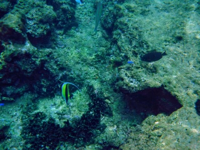 すぐにでも飛び込みたい気分ですが、ここは残念ながら遊泳禁止。仕方ないのでカメラだけ水中へ入れてみると、ツノダシやルリスズメダイが泳いでいました。