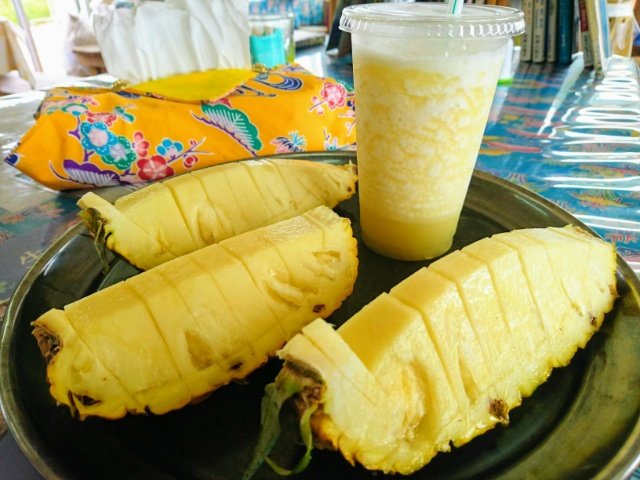 パインジュース(300円)と、パイン1皿(500円)。パインはたっぷり3カットも乗ってます。パインジュースは氷をミキサーに入れているみたいで、ちょっとシェイクのような食感。タチジャミ公園でからっからになった喉に染み渡ります!
