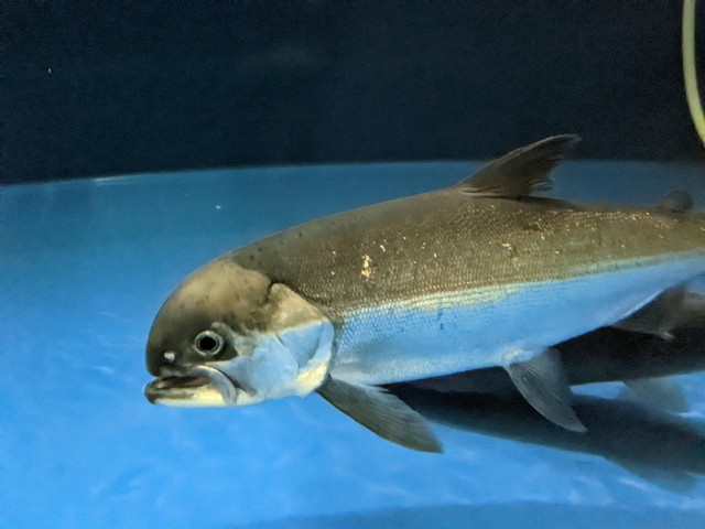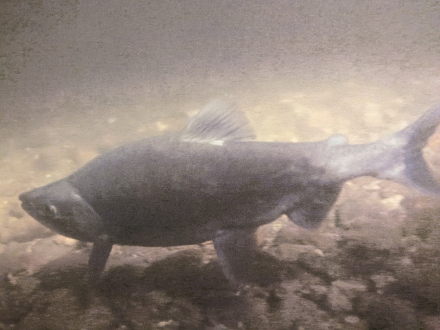 このミュージアムのメインテーマとなっているのが、こちらの「クニマス」というサカナ。サケ科に属する淡水魚で、全長は30~40cmほどに成長します。