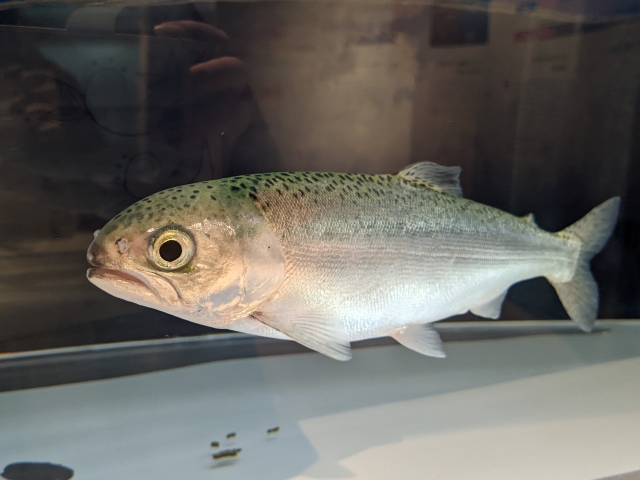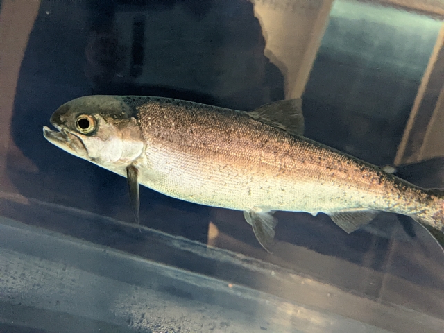 こちらはクニマスと近い「ヒメマス」。海に降りず、一生を湖で過ごす「陸封型」のベニザケです。ヒメマスと比べると、クニマスは黒っぽく斑点が無いのが特徴のようです。