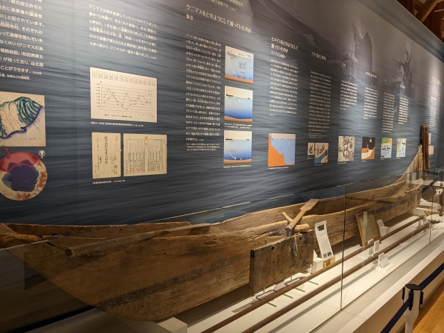 こちらの6mにも及ぶ長い舟は、一本の丸太をくり抜いて作られた丸木舟。この舟を操り、刺し網でクニマス漁が行われていました。わかりやすい映像解説もあります。
