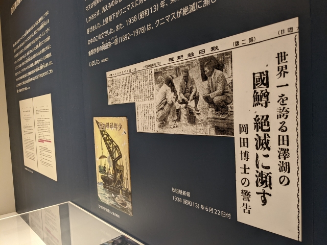 西湖ネイチャーセンターには「- 奇跡の魚 – クニマス展示館」があり、クニマスが泳ぐ水槽や田沢湖との交流の歴史を見ることができます。