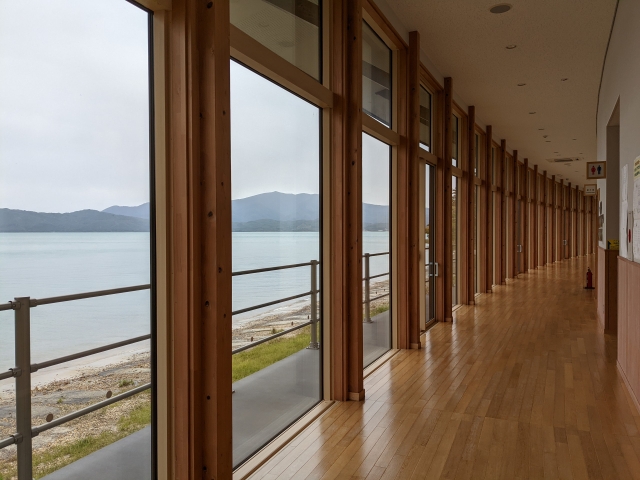 その名が示す通り、田沢湖の湖畔に建っております。館内の湖側はガラス張りとなっており、ブルーの湖面が広がるレイクビューが楽しめます。今日はあいにく曇っていますが、快晴の日はきっとキラキラ輝く湖の姿を見ることができるのでしょうね。