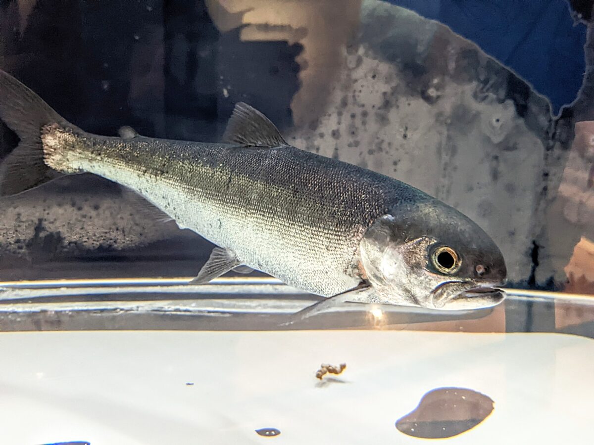 こちらはクニマスと近い「ヒメマス」。海に降りず、一生を湖で過ごす「陸封型」のベニザケです。ヒメマスと比べると、クニマスは黒っぽく斑点が無いのが特徴のようです。