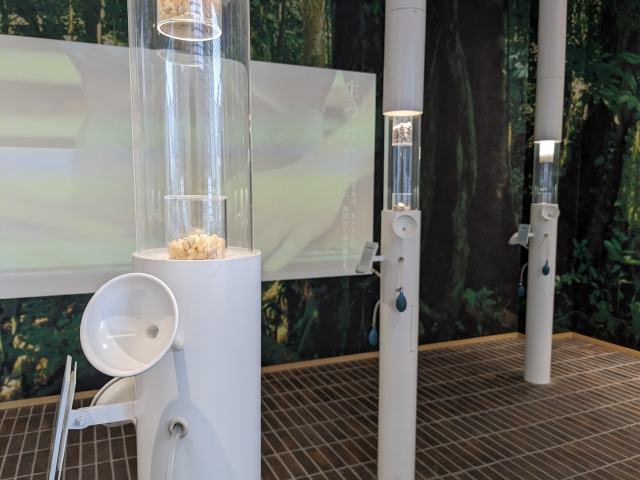 白い柱からラッパが生えたような姿の「香りの柱」。柱の中には香りの原材料がそのまま展示されており、垂れ下がるエアーポンプをシュポシュポするとその香りを体験することができます。
