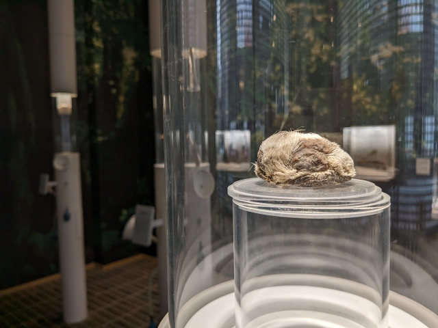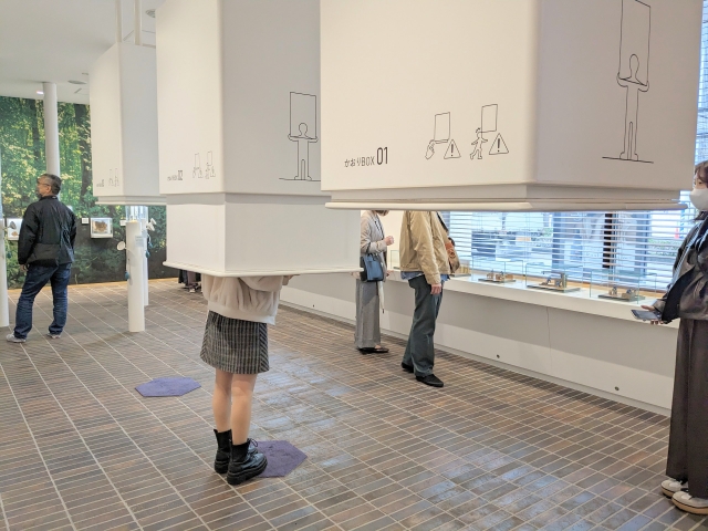 天井から釣り下がっている謎の白い箱。こちらは香りが満たされた「かおりBOX」。下から頭をつっこんで香りを体感できるという展示です。