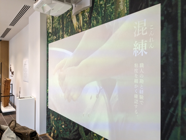 スクリーンでは松栄堂で働く職人たちのワザが流れています。黙々と進められる作業で、徐々にお線香ができあがっていきます。会話などは無い映像ですが、細部にまでこだわりを感じます。