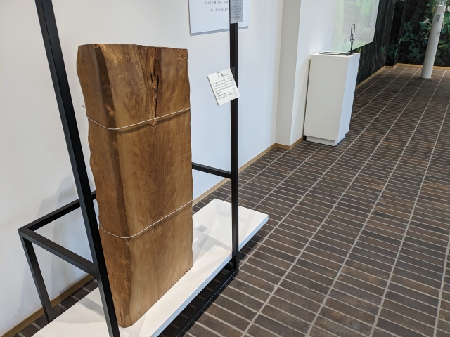 展示された白檀。別名「サンダルウッド」とも呼ばれる、香水などでもおなじみの香料です。この白檀は重さ72kgというかなりの巨木。香りを嗅ぐだけでなく自由に触ることもできます。
