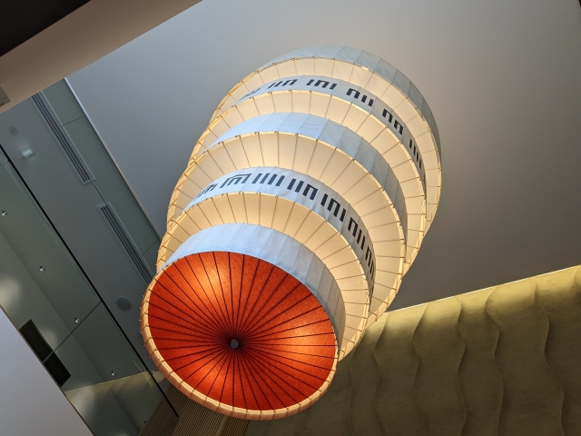 ふと天井を見上げると照明が和傘仕立て。京和傘の老舗「日吉屋」が手掛けたという「和傘シャンデリア」が入館者を出迎えます。