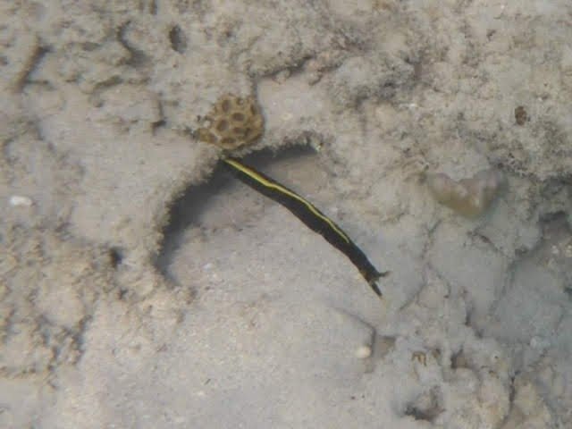 ちょっとレアなハナヒゲウツボも見かけました!細くてヘビのようなウツボなのですが、名前の通り鼻先からヒゲのような触覚のようなものが伸びている一風変わったウツボです。