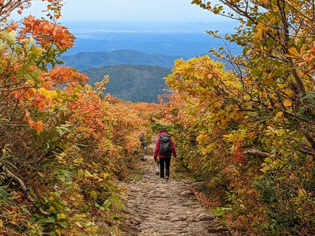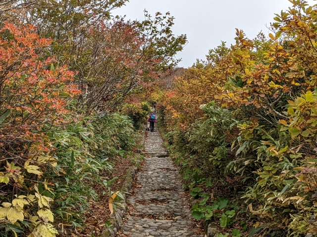 8:30 スタートから30分ほどで石畳はおしまい。少し開けた感じの道に変わります。山頂に向けて広がって行く紅葉を見ながら進めるので、気持ちが高まる登山道。