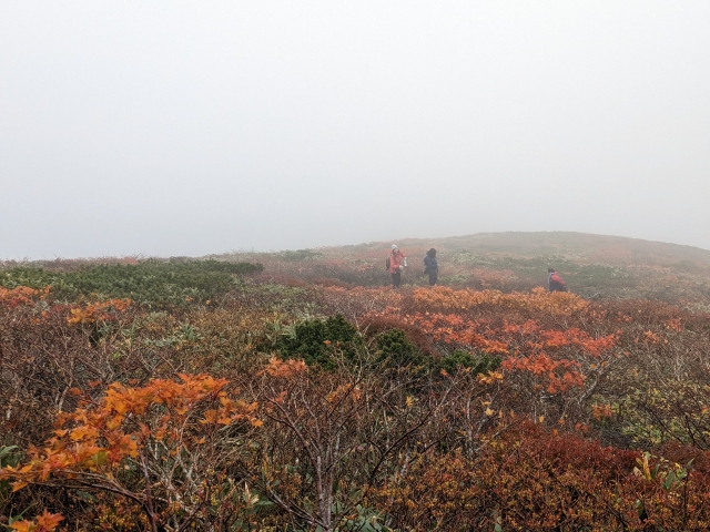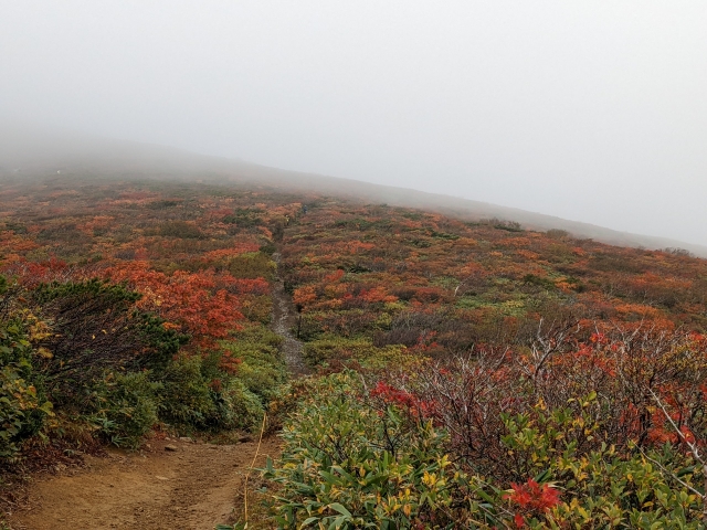 ここからの傾斜はかなり緩やか。道幅も広くサクサク進めますが、風はなかなか強く冷え込んできます。気が付けば辺り一面霧の世界、真っ白で何も見えなくなってきました。先ほどは見えていた紅葉の景色も、どんどん白く霞んで行きます。やっぱり写真は撮れるうちに、です。