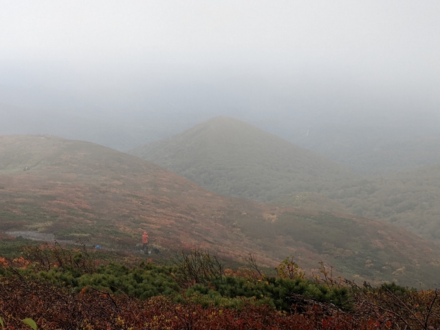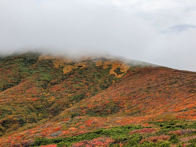 振り返ると、ほんの一瞬雲が減って、山頂方面に広がる紅葉もチラリ。山全体が色づく姿は壮観ですね!